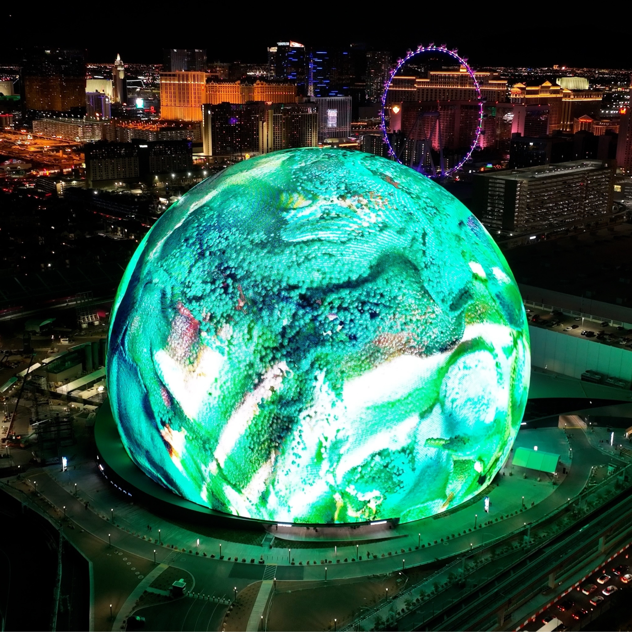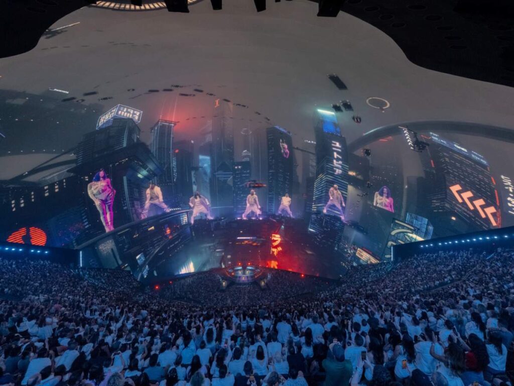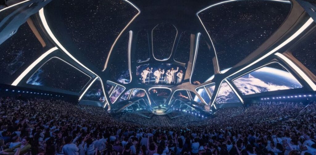 Küre şeklindeki bu dev yapı 112 metre yüksekliği, 157 metre genişliği ve 17.000 kişilik kapasitesiyle sadece bir konser salonu değil, başlı başına bir deneyim alanı. Dış cephesi tamamen LED ekranlarla kaplı ve şehrin dört bir yanından görülen görsel şovlar yaratıyor; içeride ise 160.000’den fazla hoparliden çıkan 4D ses sistemi ve 16K çözünürlüklü dev ekranıyla her koltukta “sahnedeymiş” gibi hissettiren bir atmosfer sunuyor.